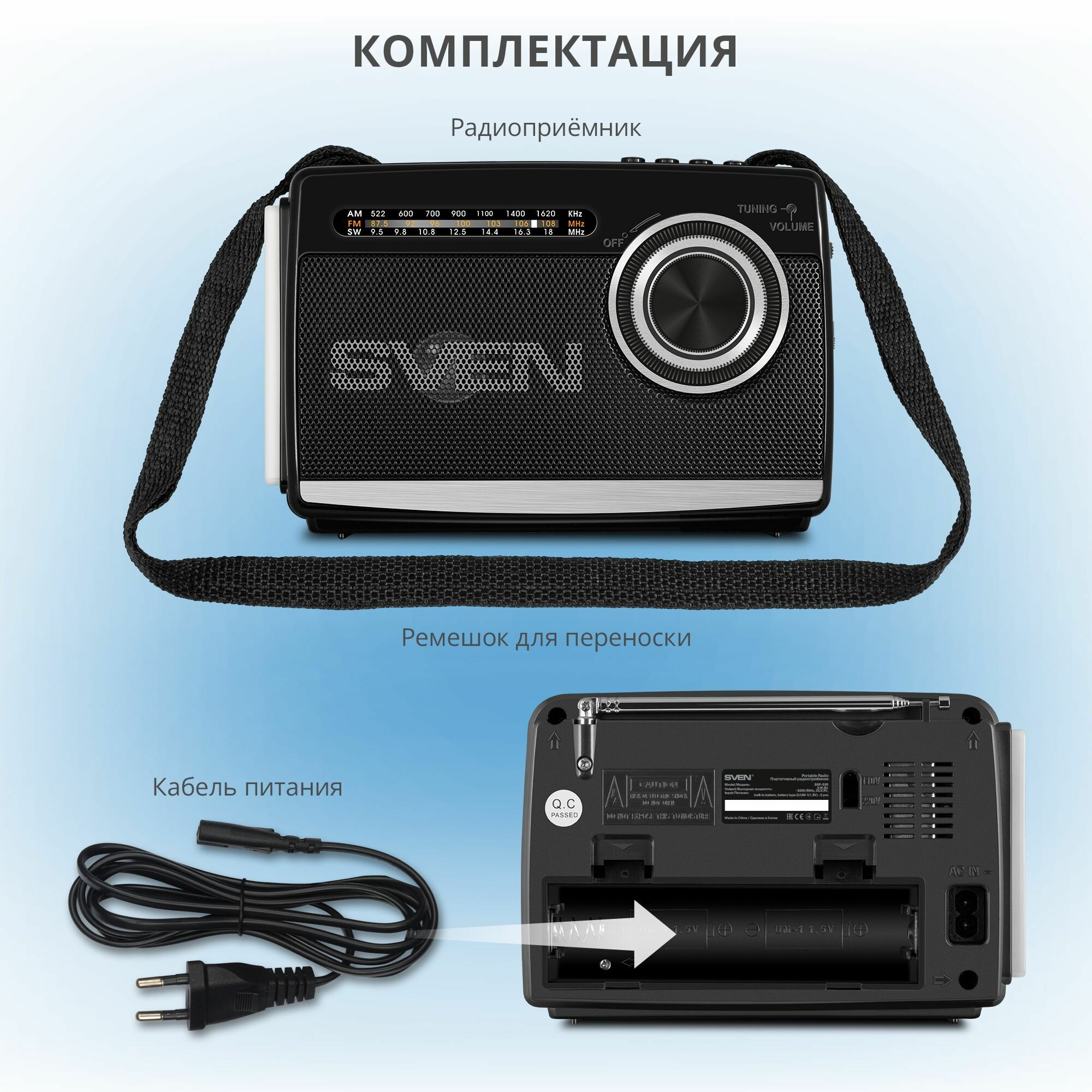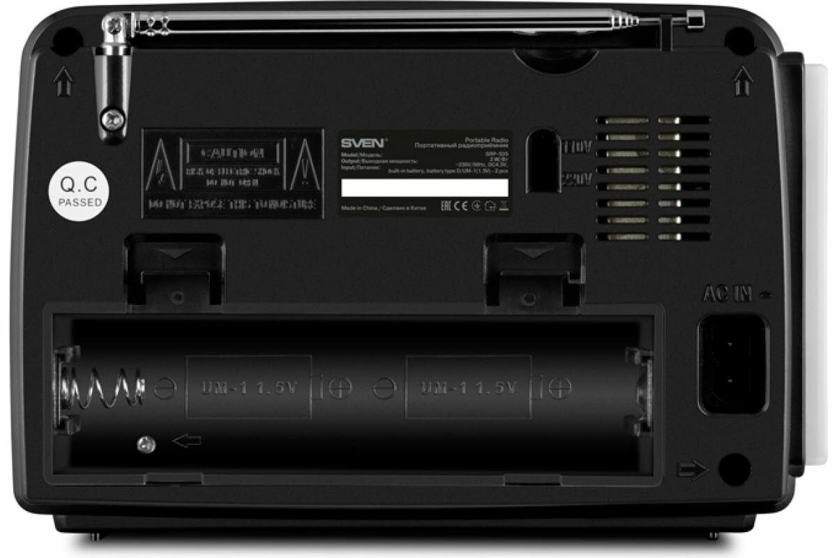 SVEN SRP-535 Радиоприёмник чёрный (3 Вт, FM/AM/SW, USB, SD/microSD, 900 мАч, 2 х D/UM, фонарь)