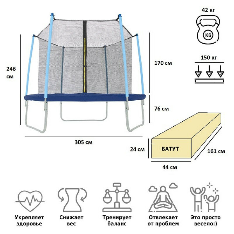 | Минусы: | При весе прыгуна более 100 кг батут начинает раскачиваться, надо крепить к земле. Не хватает лестницы в комплекте - маленьким детям сложно забираться. |