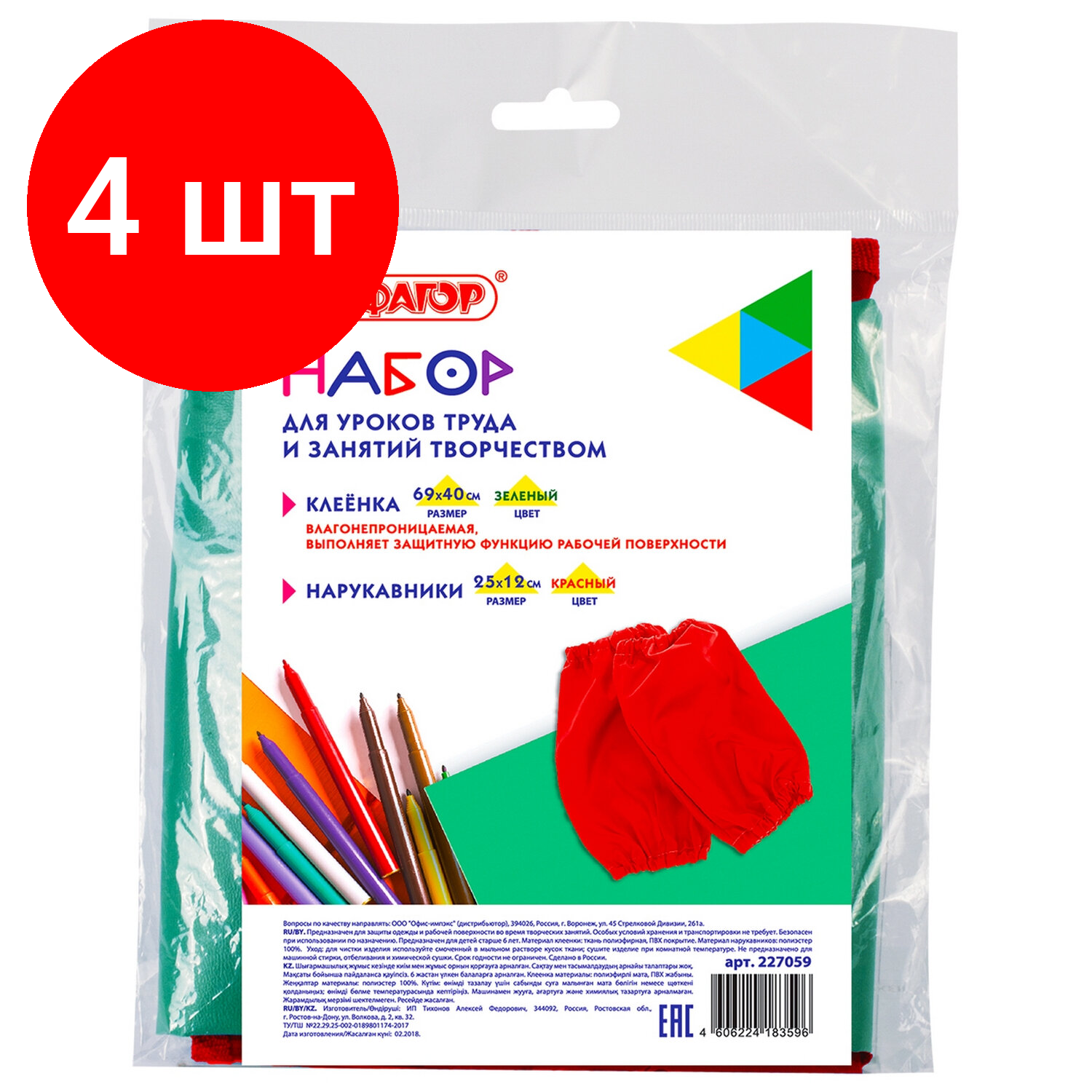 Комплект 4 шт, Набор для уроков труда пифагор: клеёнка ПВХ зеленая, 69х40 см, нарукавники красные, 227059