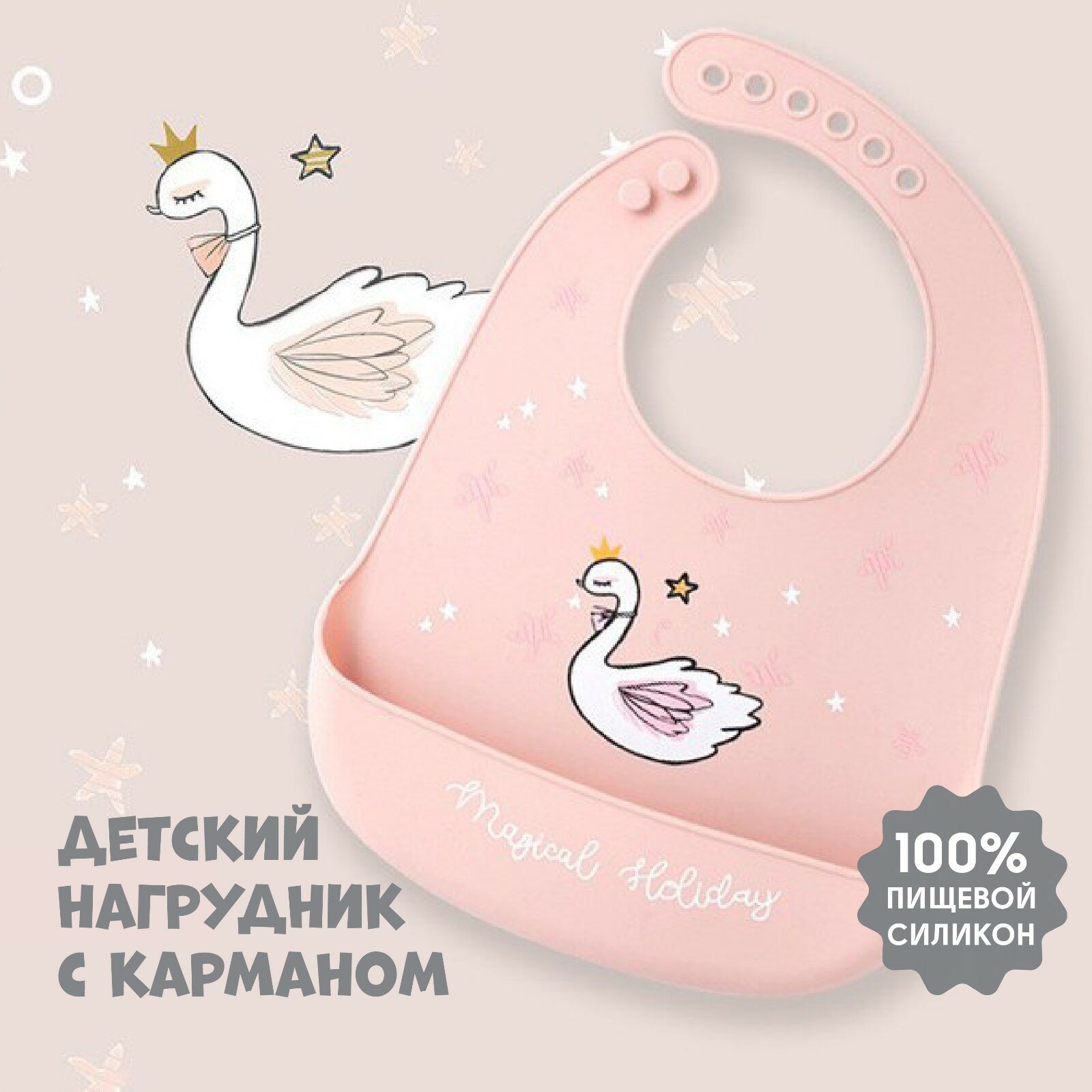 Нагрудник для кормления "Лебедь" силиконовый с карманом, цвет розовый