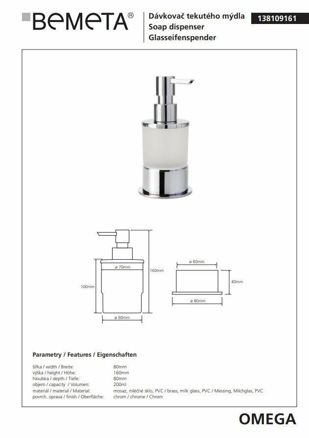 Дозатор для жидкого мыла Bemeta Omega 138109161 хром