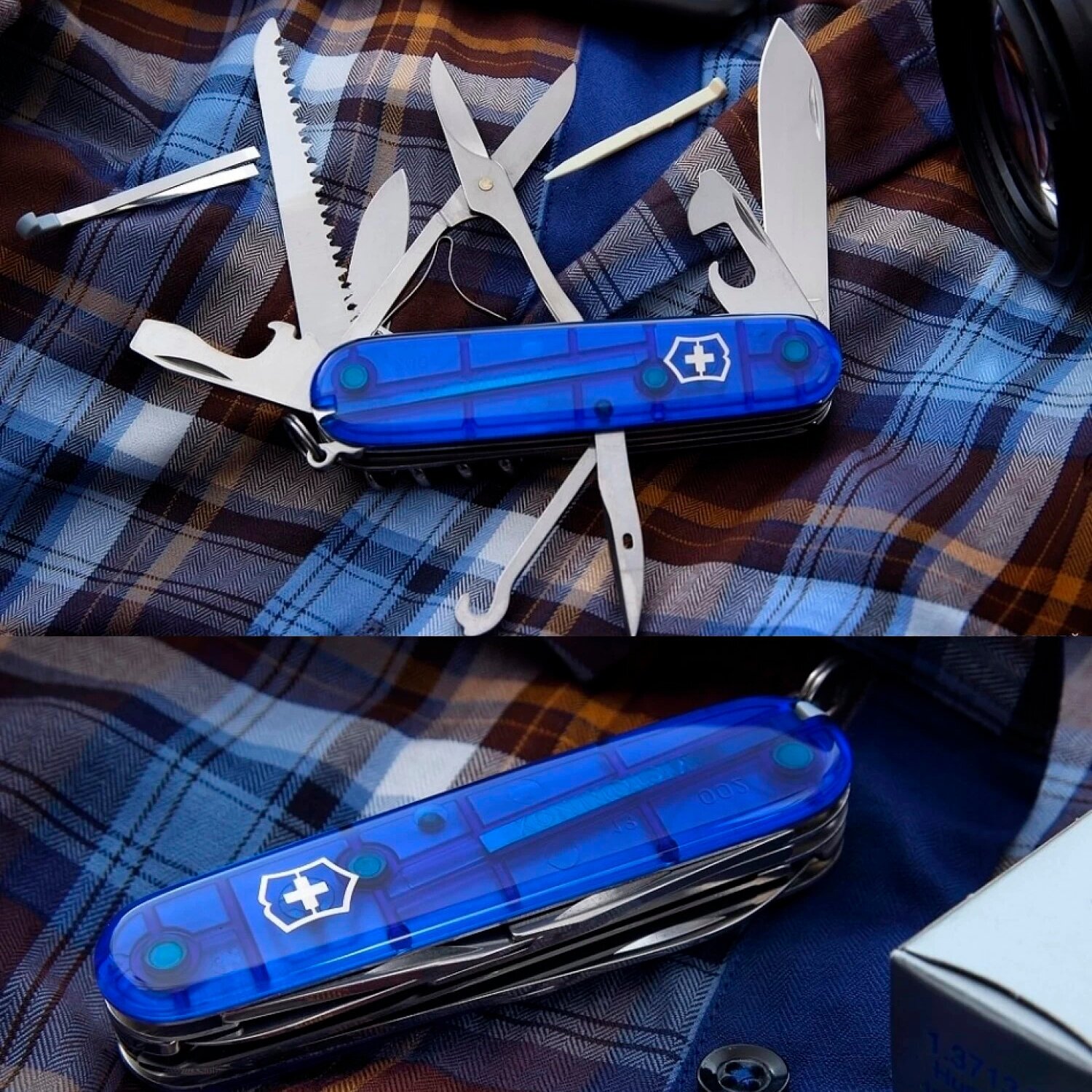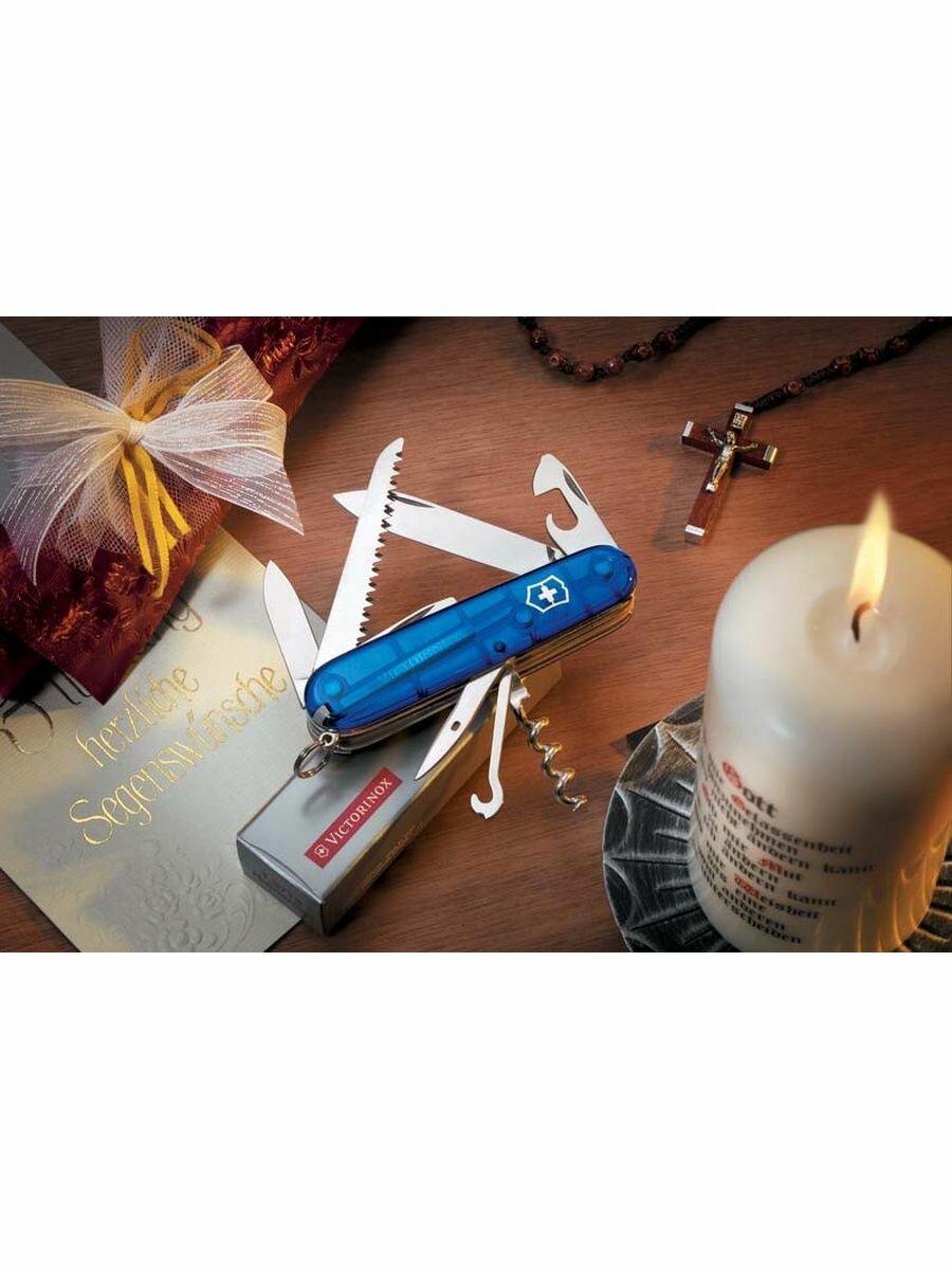 СохранитьНож перочинный Victorinox Huntsman (1.3713.T2) 91мм 15функц. синий полупрозрачный карт.коробка интересное: