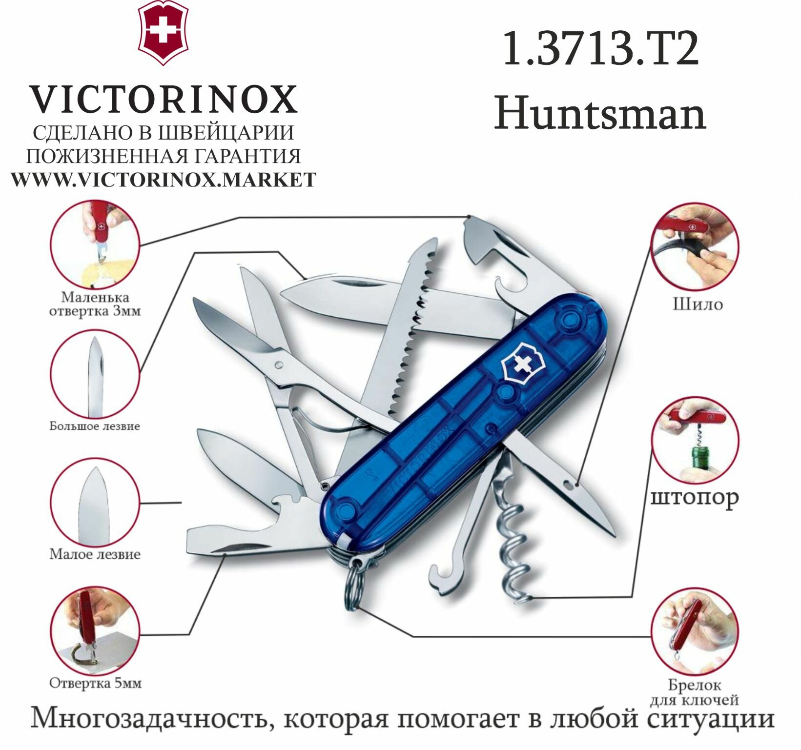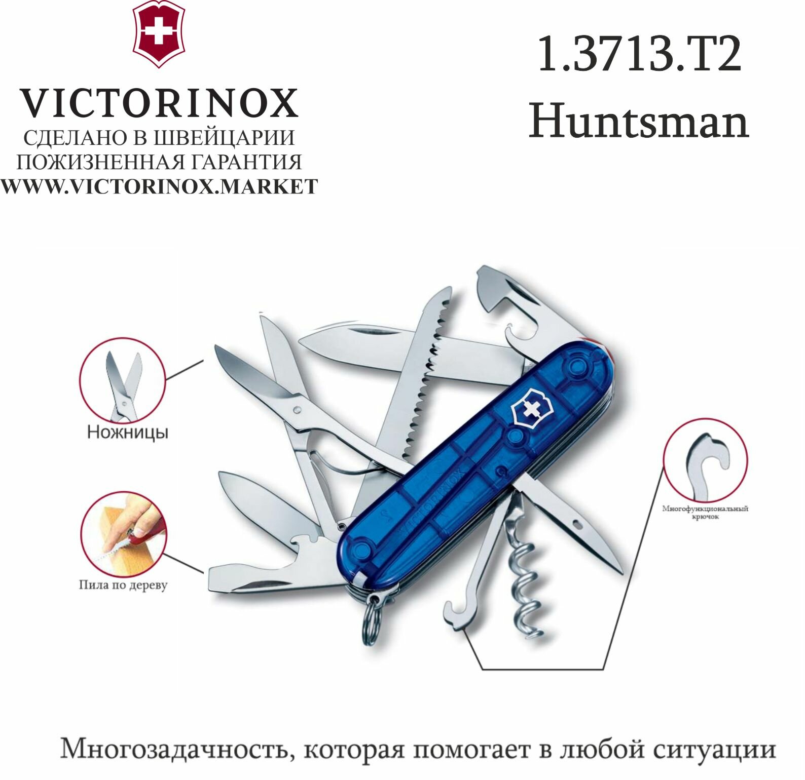 Купить Нож перочинный Victorinox Huntsman (1.3713.T2) 91мм 15функц. синий полупрозрачный карт.коробка