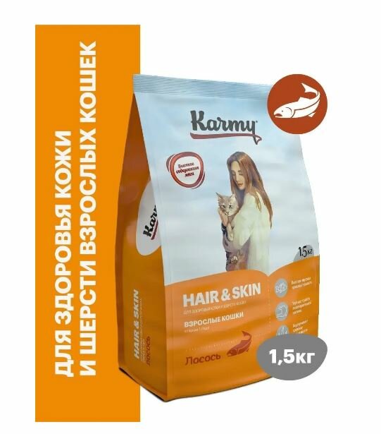 Сухой корм Karmy для кошек Hair&Skin, поддерживающий здоровье кожи и шерсти, лосось, 1,5 кг