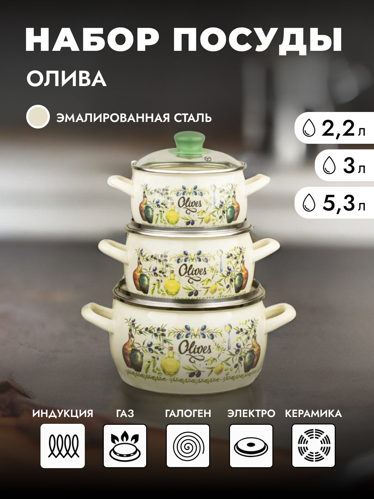 Набор посуды 6пр.(2,2л+3л+5,3л)мет.ручк. "Олива"Эксклюзив2821 (1) 193136