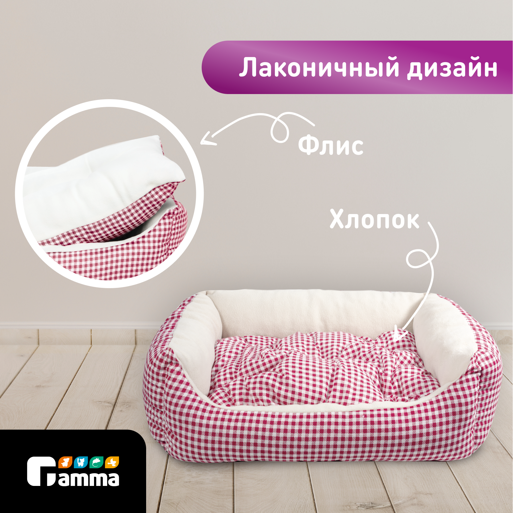 Гамма Лежанка для животных "Кантри макси" красная, 52*45*17см, бязь