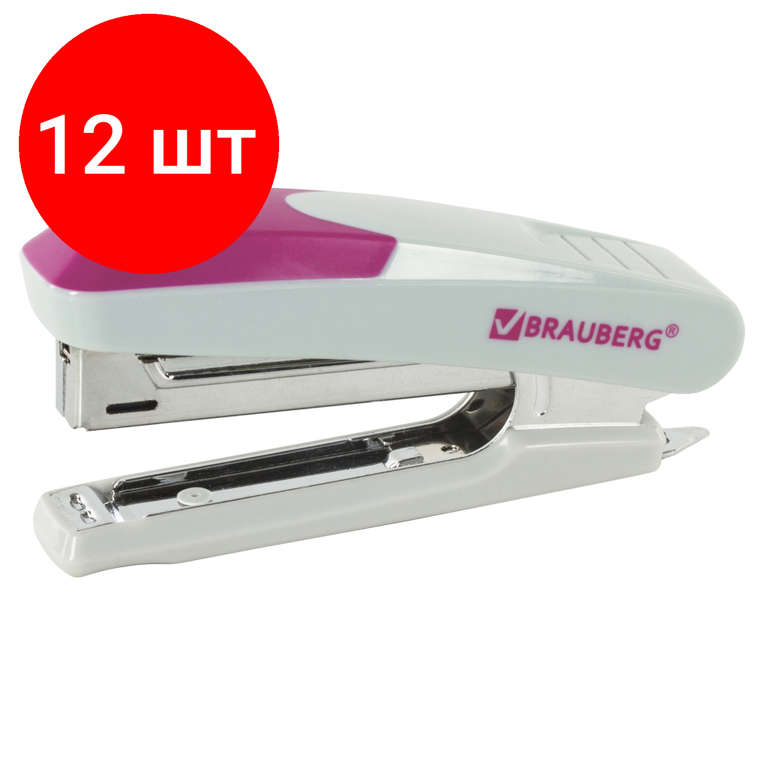 Комплект 12 шт, Степлер №10 BRAUBERG "Delta", до 12 листов, с резиновой накладкой и антистеплером, серый, розовая вставка, 222556