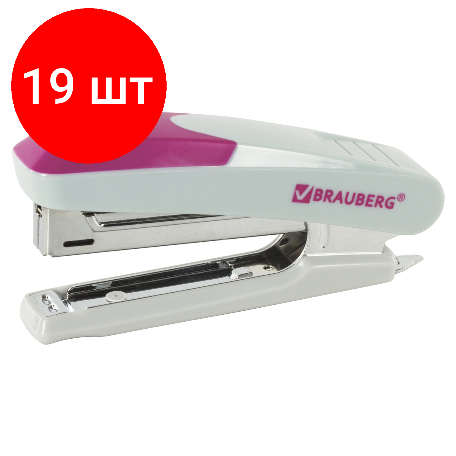 Купить Комплект 19 шт, Степлер №10 BRAUBERG "Delta", до 12 листов, с резиновой накладкой и антистеплером, серый, розовая вставка, 222556