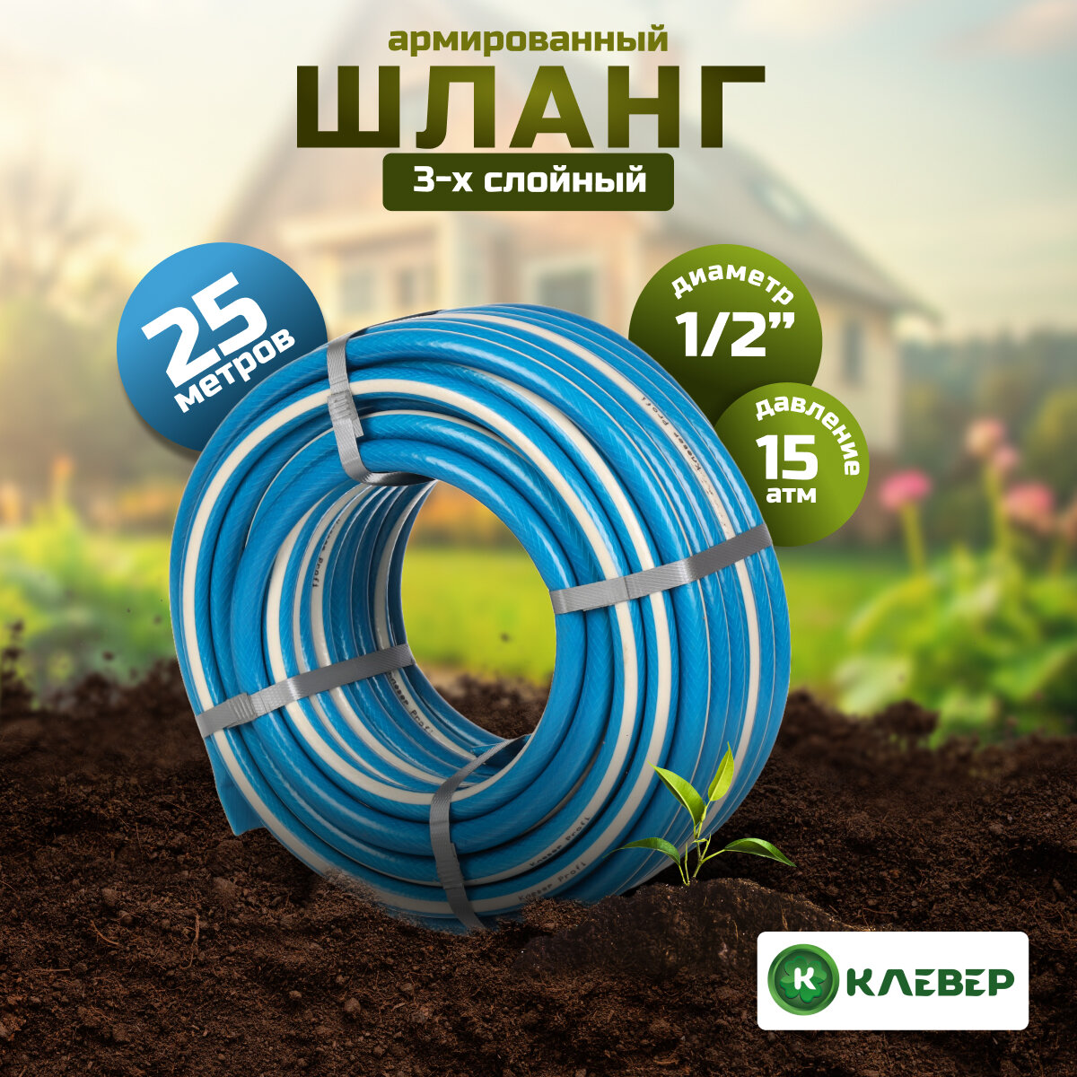 Купить Шланг поливочный садовый 1/2 25 м армированный трехслойный, диаметр 15 мм, Клевер