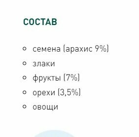 | Плюсы: | Корм разнообразный по составу. Свежий запах. Много орехов. |