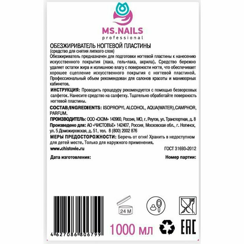 MS NAILS, Обезжириватель ногтевой пластины и средство для снятия липкого слоя, 500 мл 601-207