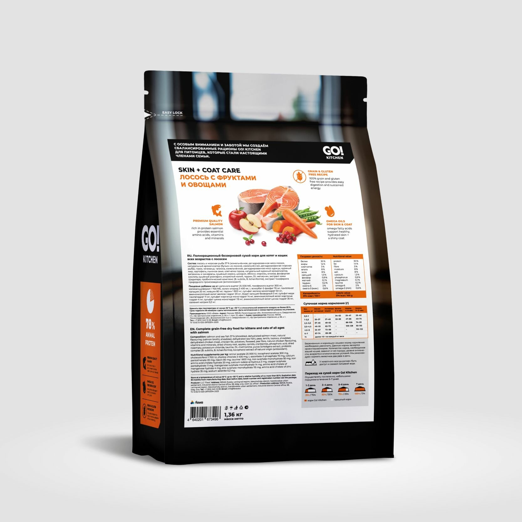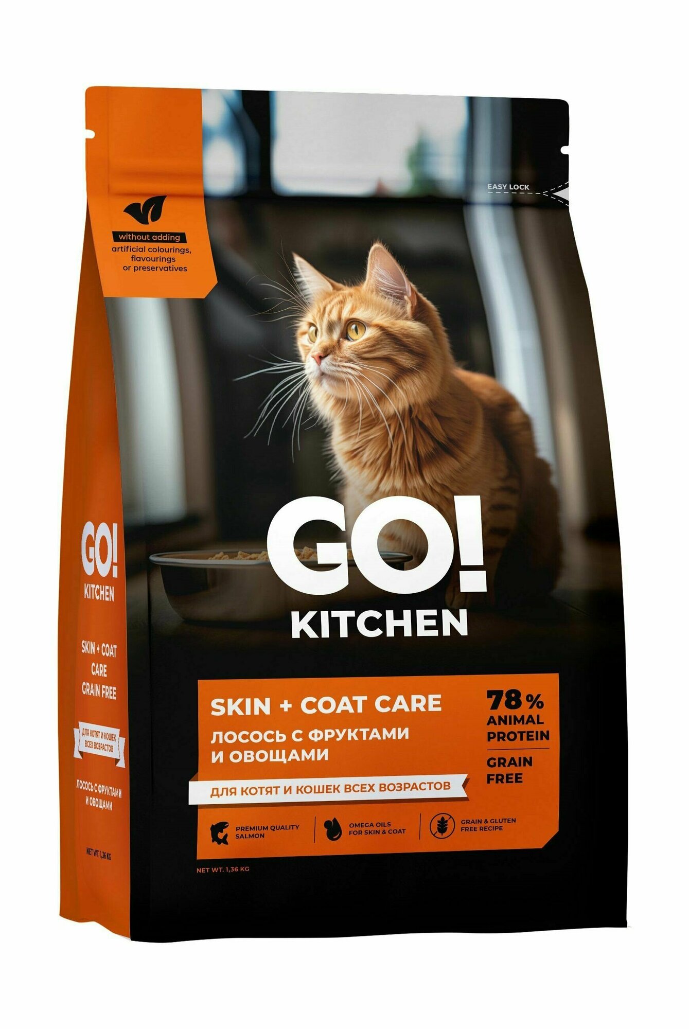 GO'KITCHEN сухой корм для котят и кошек всех возрастов со свежим лососем, фруктами и овощами, HAIR+SKIN CARE Salmon (3.63 кг)