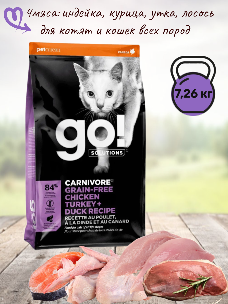 Сухой корм GO! CARNIVORE GF Chicken, Turkey + Duck Recipe CF для котят и кошек беззерновой 4 вида Мяса: Курица, Индейка, Утка и Лосось (7.26 кг)