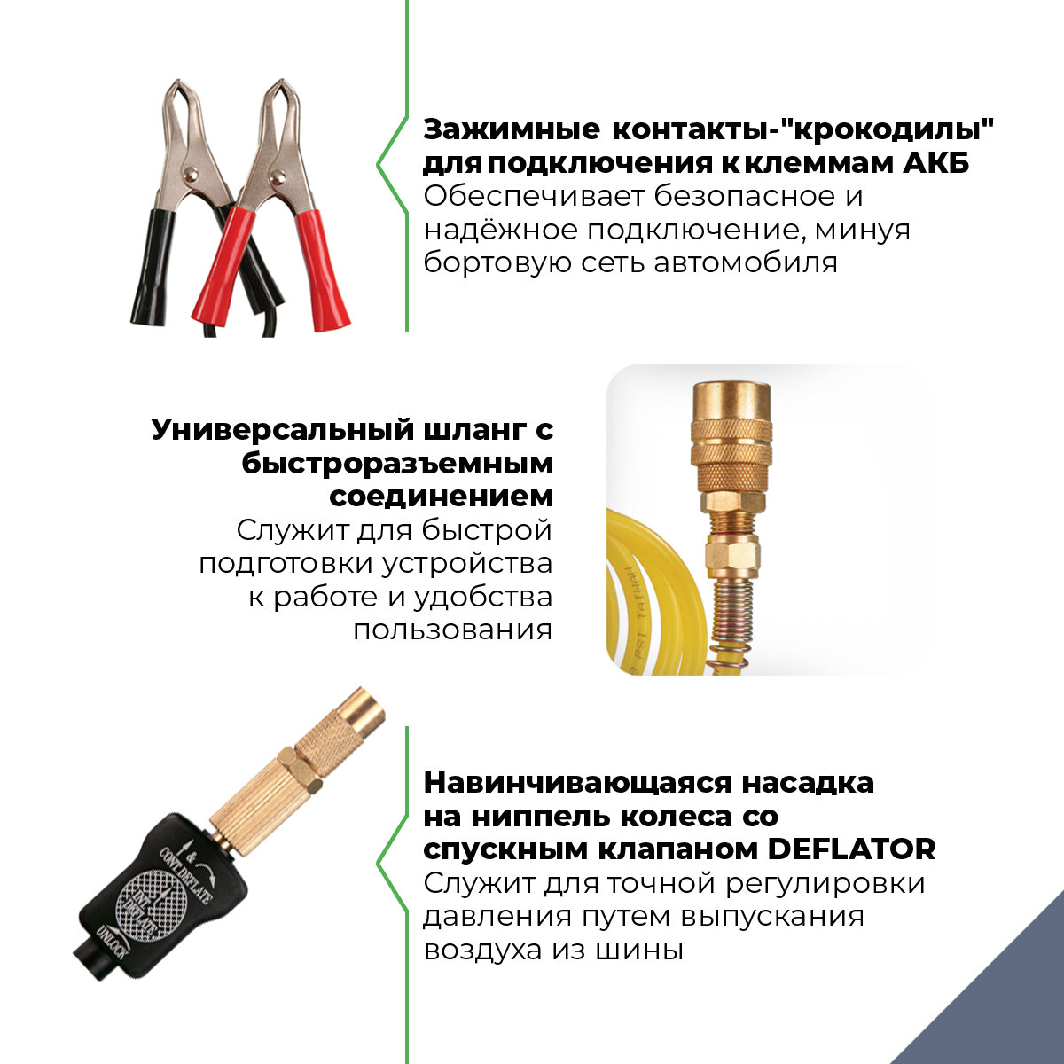 | Плюсы: | Работа от клемм аккумулятора, возможность стравить избыточное давление, отлично подходит для колёс R20. |