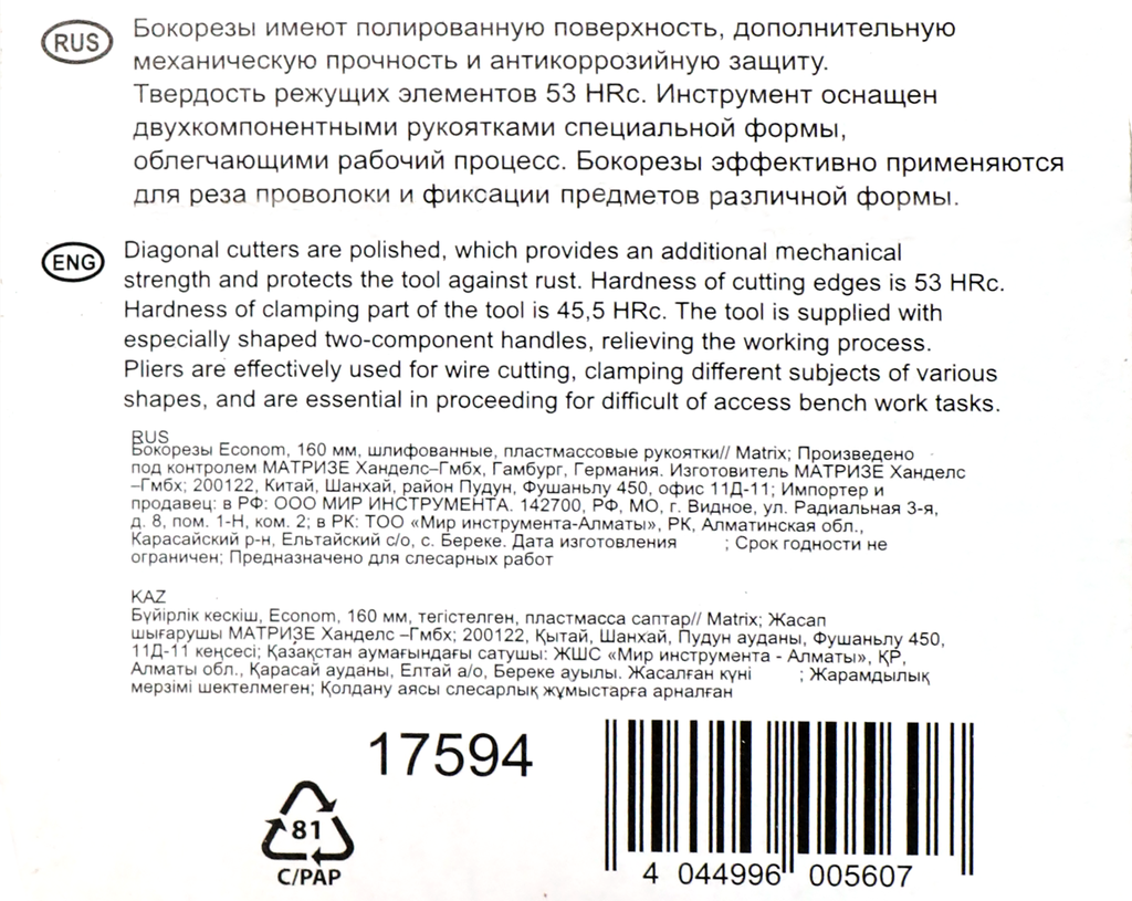 Ниже Вы можете прочитать отзывы на Бокорезы Matrix Econom 160 мм, шлифованные, пластмассовые рукоятки 17594, ознакомится с подробными характеристиками, посмотреть интересные обзоры и фотографии на Бокорезы Matrix Econom 160 мм, шлифованные, пластмассовые рукоятки 17594.