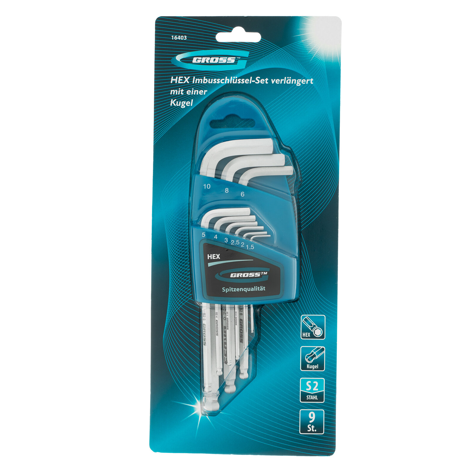 Набор ключей имбусовых HEX, 1,5–10 мм, S2, 9 штук, удлиненные с шаром, сатинированные Gross [16403]