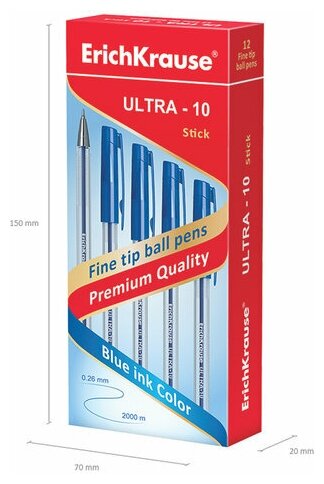 Ручка шариковая Erich Krause ULTRA-10, узел-игла 0.7 мм, толщина линии 0,26 мм, чернила синие, длина линии письма 2000 метров./В упаковке шт: 12