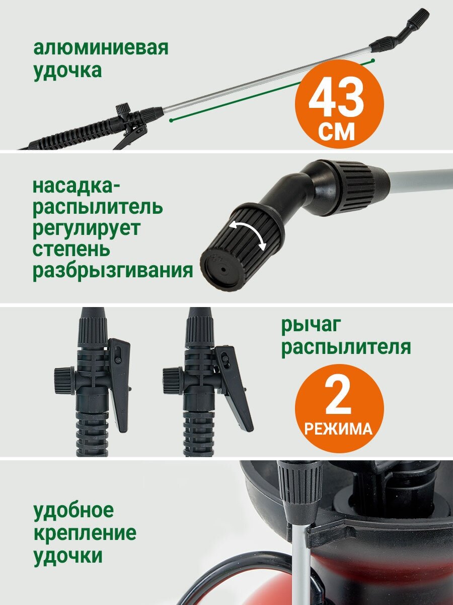 | Минусы: | Реальная фотография и комплектация не соответствует действительности. У поводка опрыскивателя-нет второго удлиняющегоколена, из за чего его длина очень короткая, соответственно опрыскивающий раствор попадает на работника. Сопло пластиковое, а на фото металл. Сопло не поворотное, а на фото с поворотным коленом. |
