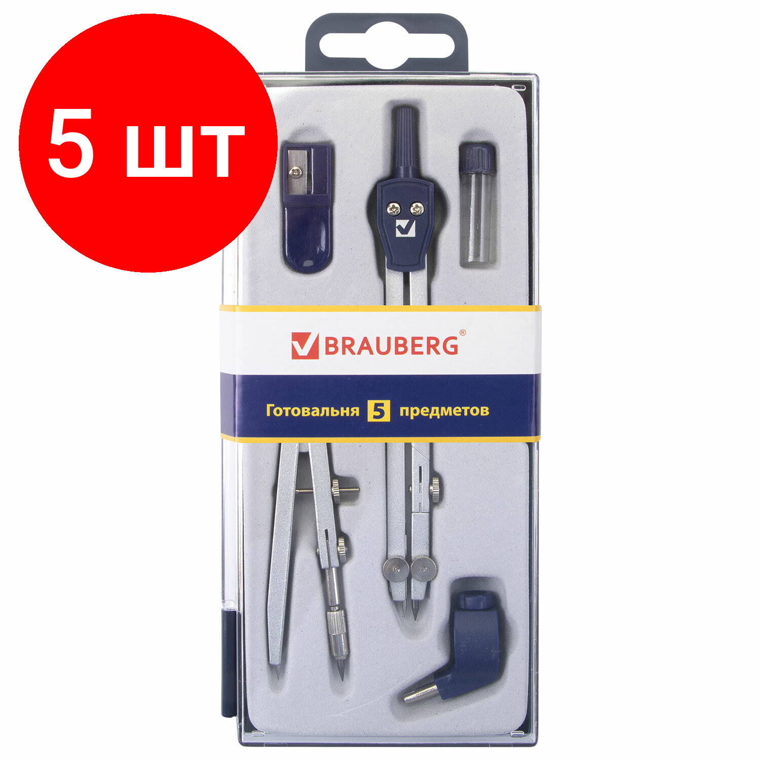 Комплект 5 шт, Готовальня BRAUBERG "Student Oxford", 5 предметов циркуль + кронциркуль, держатель, грифель, точилка, 210338