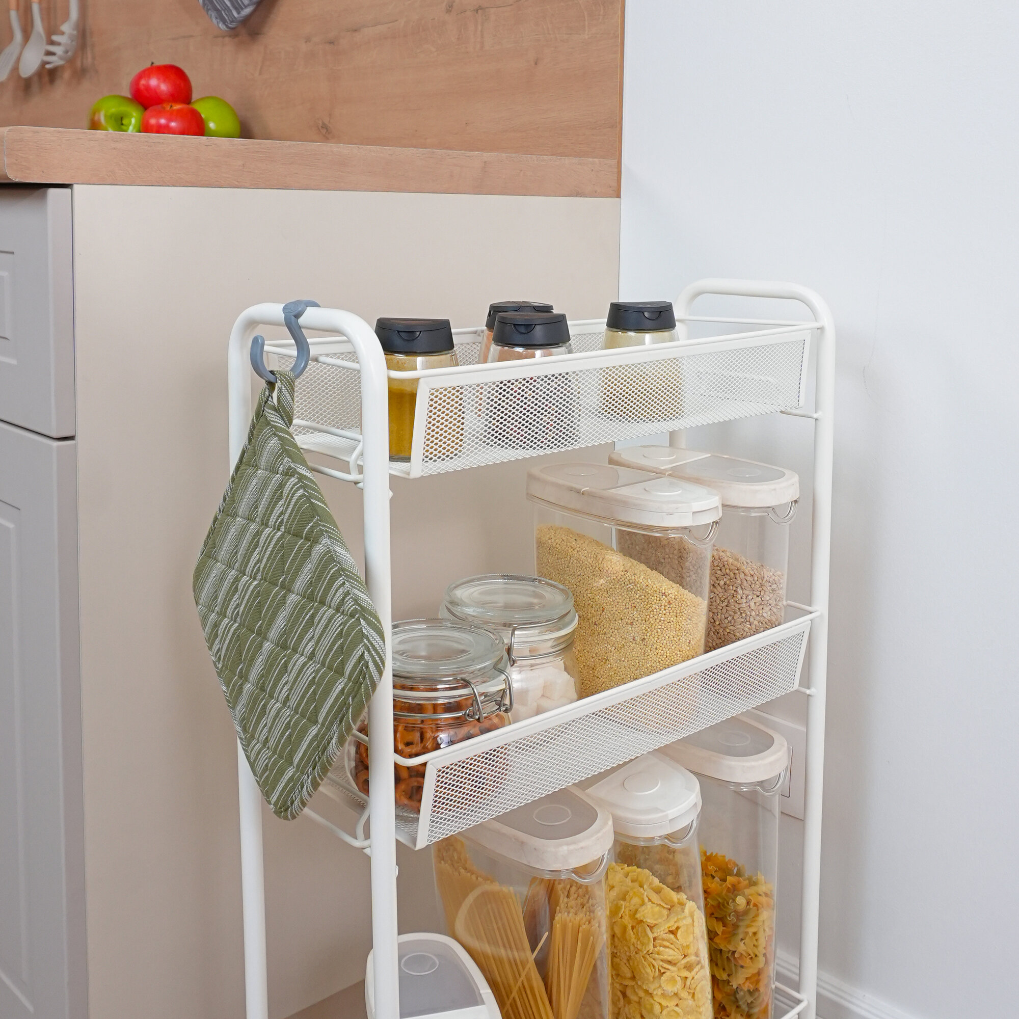 | Плюсы: | Собирается очень легко, без инструмента и крепежа, широкие полки (помещается 3-литровая банка), на колесиках, что удобно при уборке. Металлическая полностью. |
