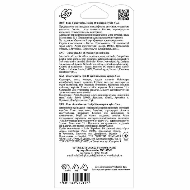 Гели с блестками ЛУЧ «Блеск», 10 цветов (4 вида), в тубах по 5 мл, блистер