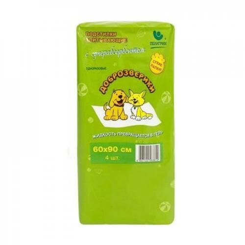 Доброзверики подстилки впитывающие для животных с суперабсорбентом 60х90 см, 4 шт. "Сухие лапки"