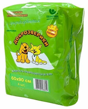 Доброзверики подстилки впитывающие для животных с суперабсорбентом 60х90 см, 4 шт. Сухие лапки