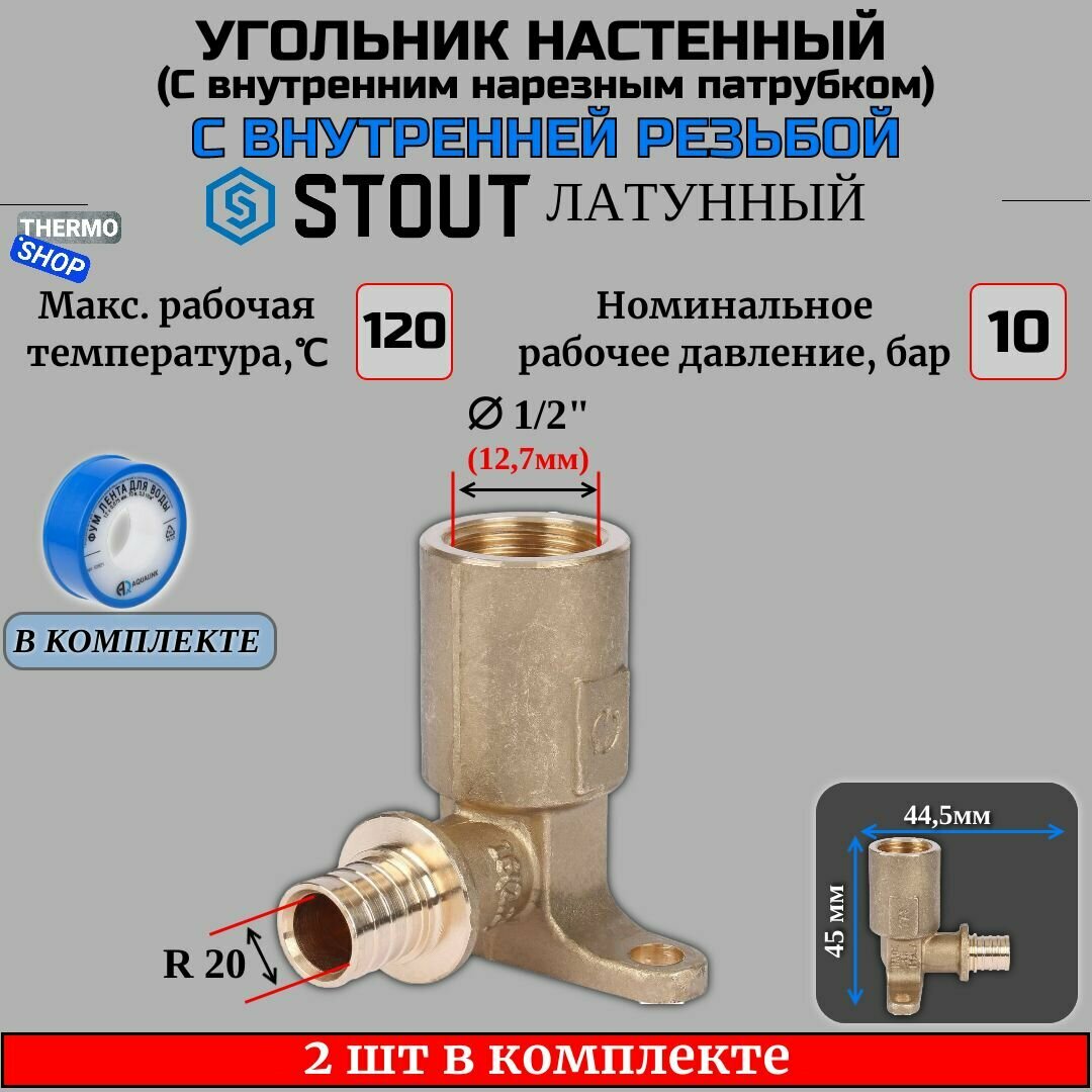 Купить Угольник настенный с длинным нарезным патрубком 20-Rp 1/2" для труб 2 шт из сшитого полиэтилена аксиальный ФУМ лента 10 м