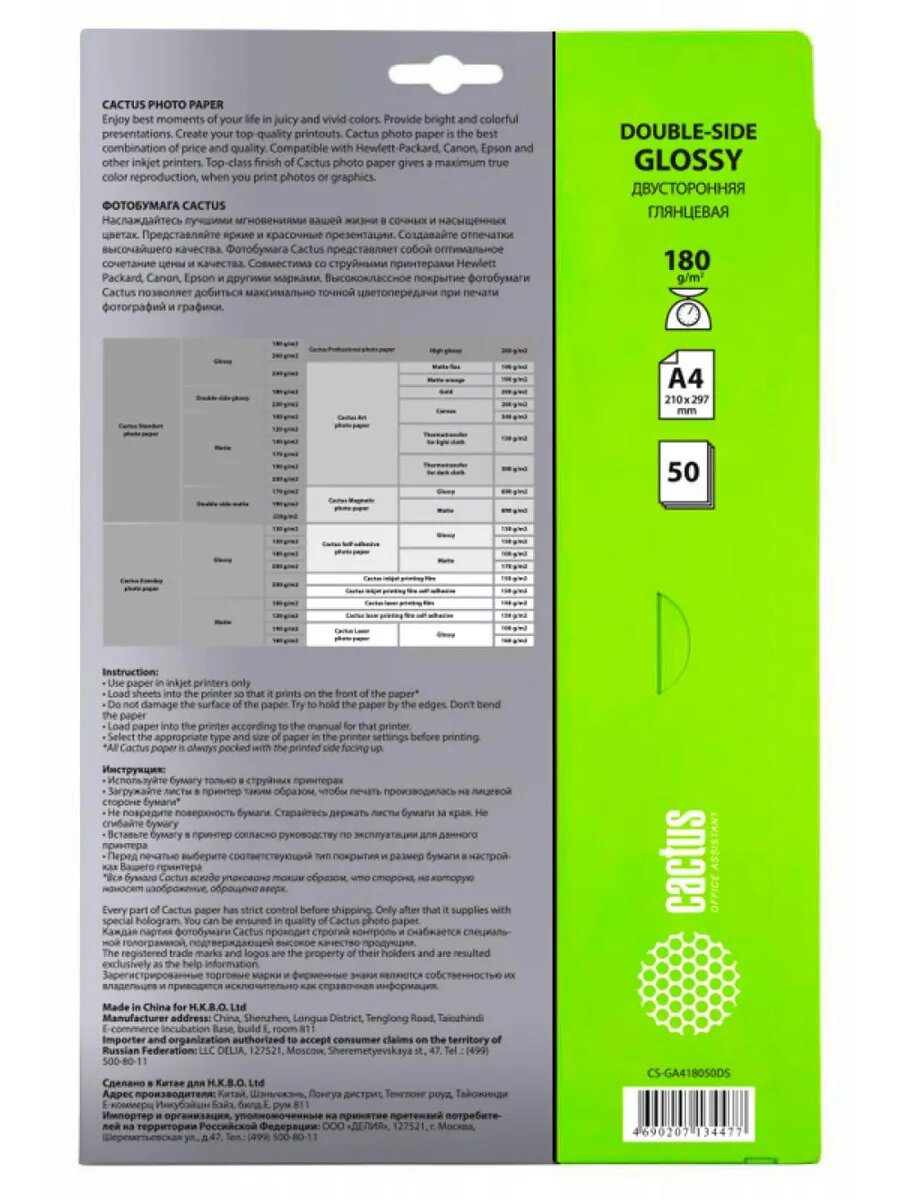 Фотобумага Cactus CS-GA418050DS, глянцевая, А4, 180 г/м2, 50 листов