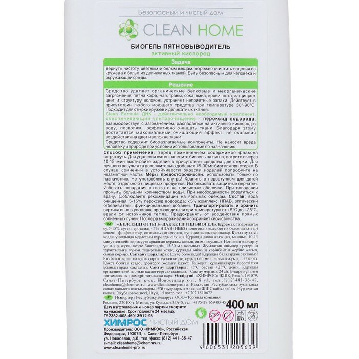 Пятновыводитель CLEAN HOME Биогель, активный кислород 400мл 4606531205639