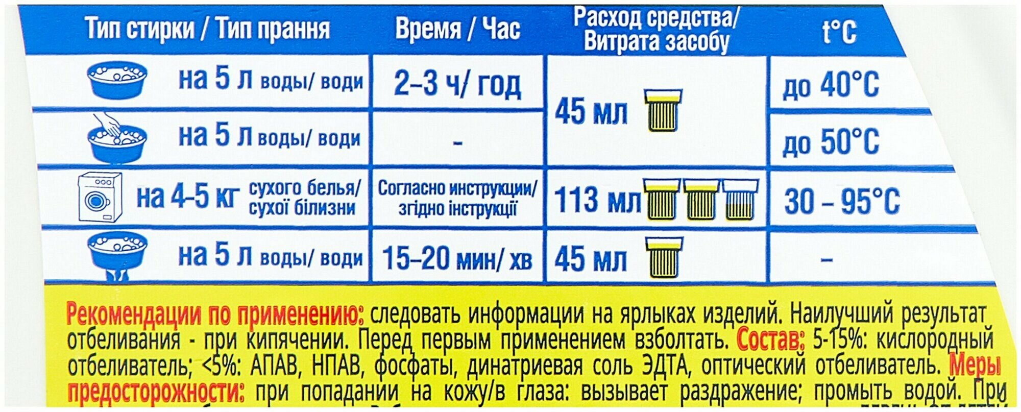 | Отзыв: | Отбеливатель очень хороший, а упакован плохо. Разлились. |