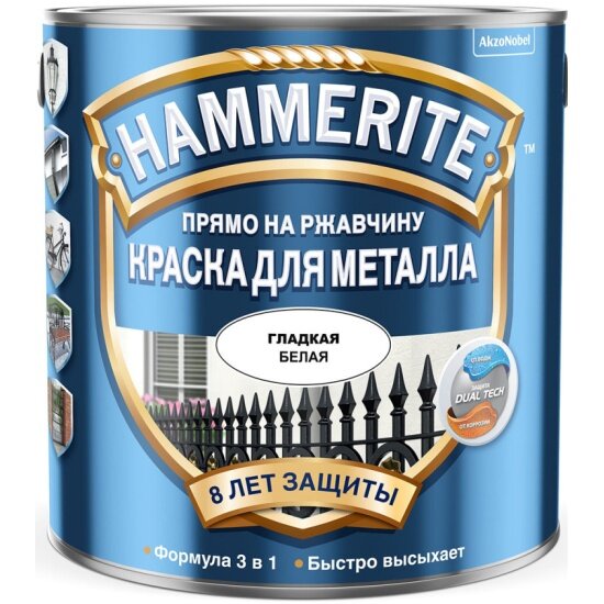 Краска для металла 3 в 1 прямо на ржавчину Hammerite гладкая глянцевая (2л) белый RAL 9003