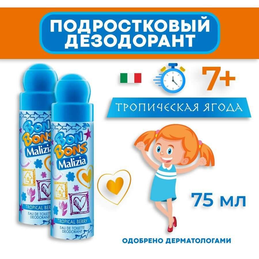Дезодорант детский Malizia Bon Bons для всех типов кожи "Tropical Berry", 75 мл, 2 шт