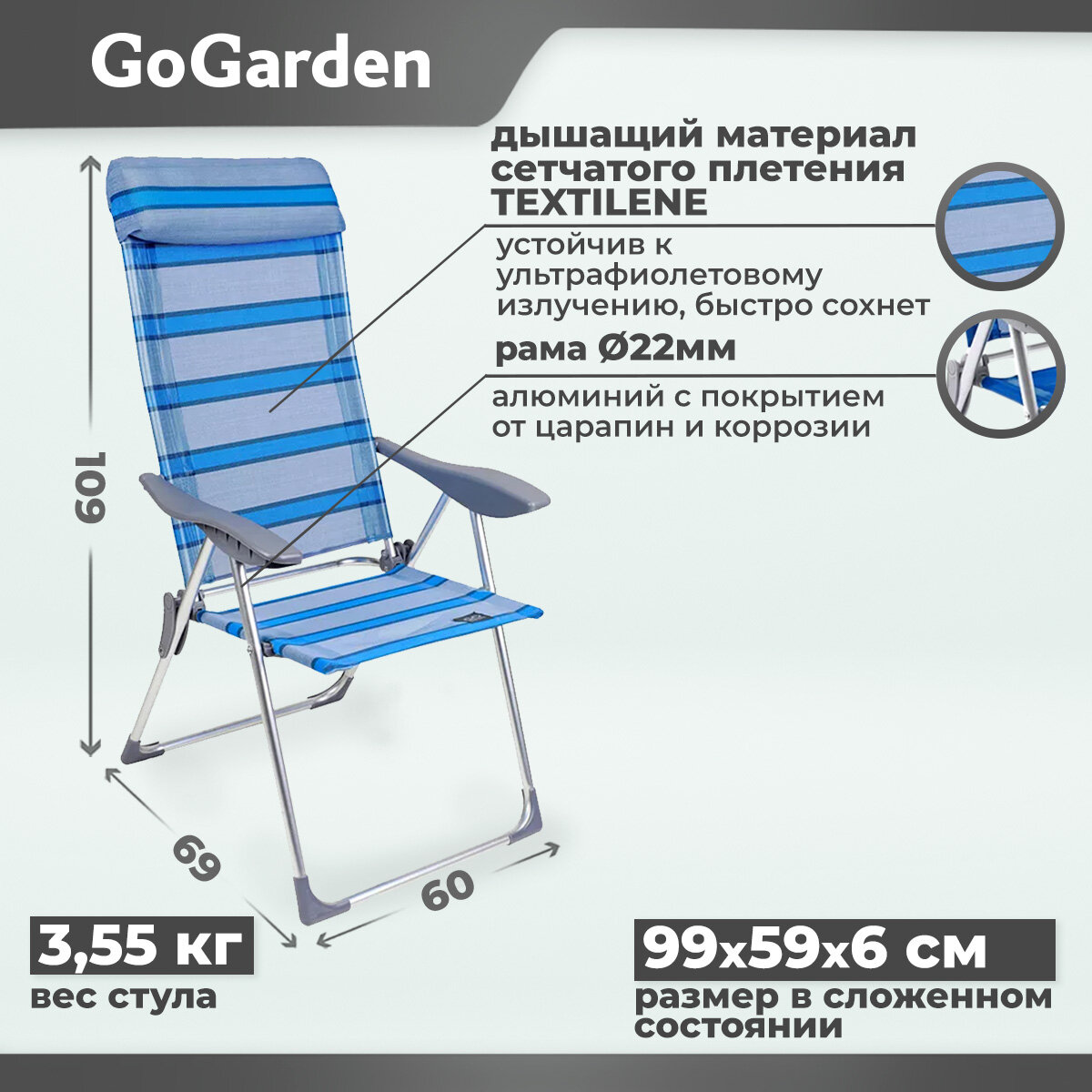 Кресло складное GoGarden SUNDAY, 5 позиций, 69х60х109 см, алюм., цвет синий