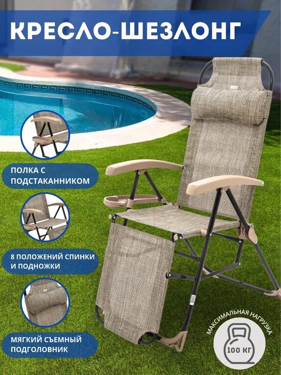 Кресло шезлонг складное с полкой, подножкой и съемным подголовником, 8 положений спинки