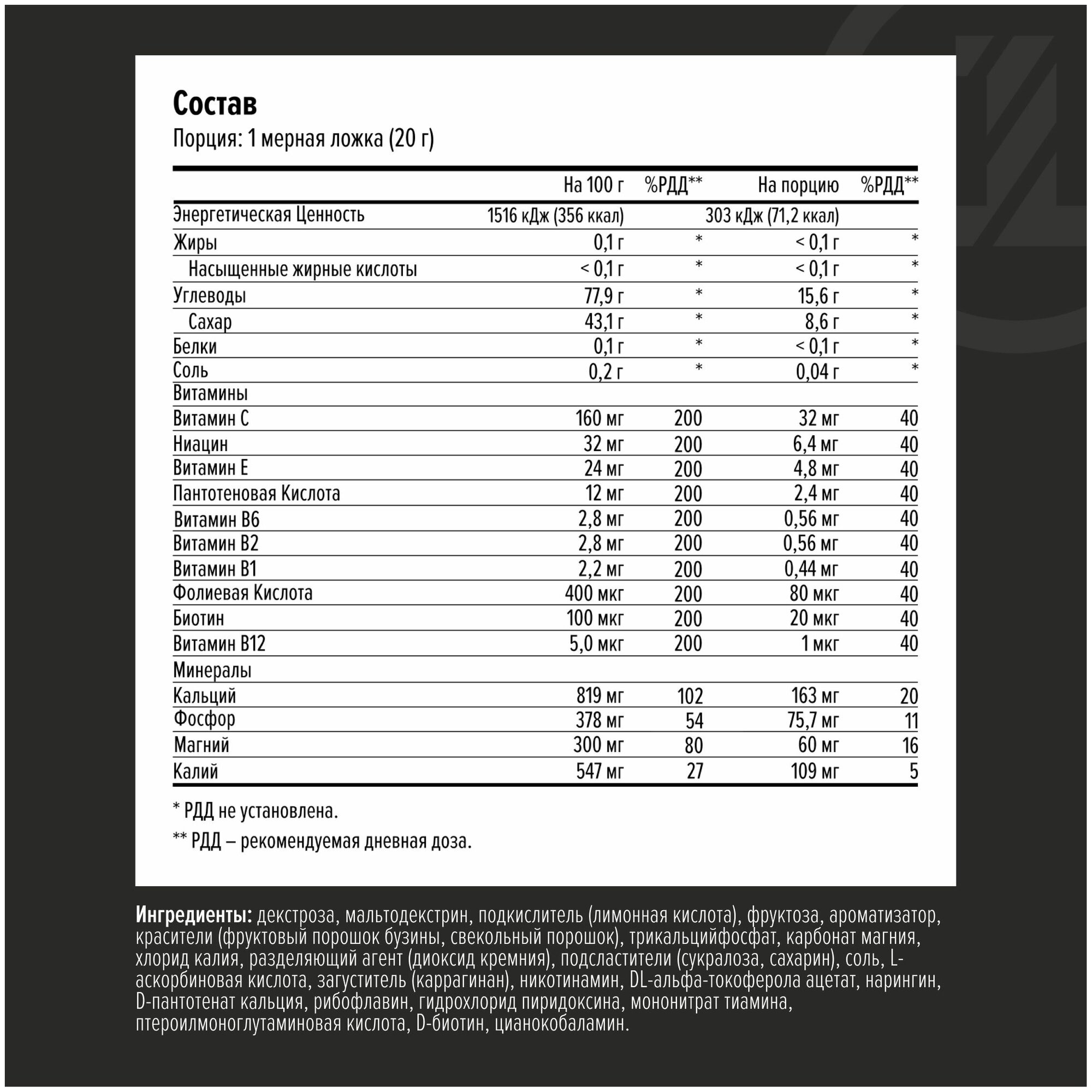 | Плюсы: | Приятный вкус ( кисло-сладкий, если хочется менее насыщенный - модно уменьшить порцию порошка на 500 мл воды), хорошо растворяется, хорошо восполняет потери углеводов на интенсивной тренировке, без негативного влияния на жкт. Всё индивидуально, конечно! Рекомендую к использованию ?? |