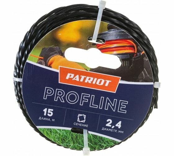 Леска для триммера 2.4 мм, 15 м, квадрат, Patriot, ProfLine/Twistline, скрученный, острые грани, черная
