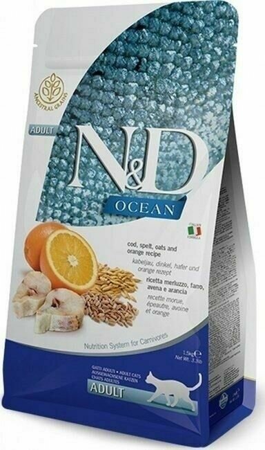 Сухой корм Farmina N&D Ocean Godfish&Orange Adult, для взрослых кошек, низкозерновой, треска, спельта, овес и апельсин, 1,5 кг