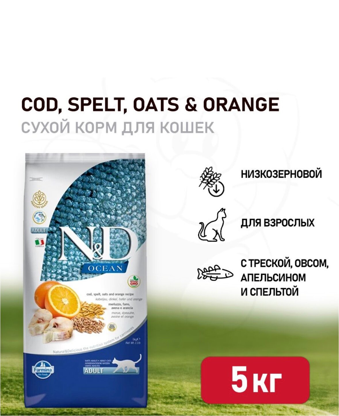 Купить Сухой корм Farmina N&D Ocean Godfish&Orange Adult, для взрослых кошек, низкозерновой, треска, спельта, овес и апельсин, 5 кг