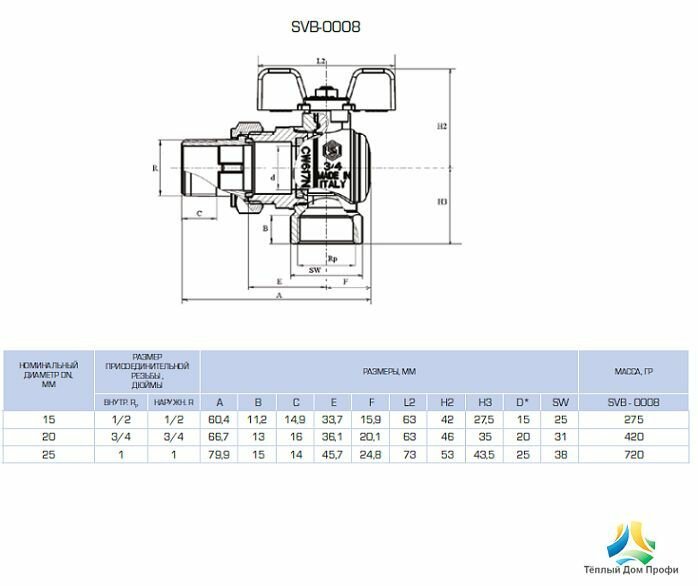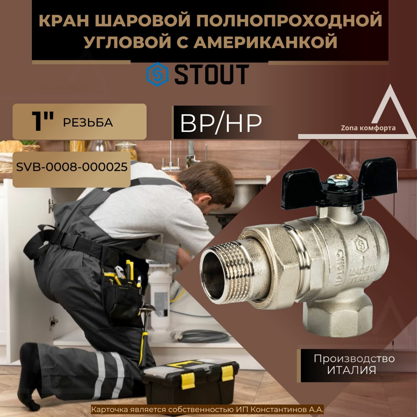 SVB-0008-000025 STOUT Кран шаровой полнопроходной угловой с “американкой“, ВР/НР, ручка бабочка 1