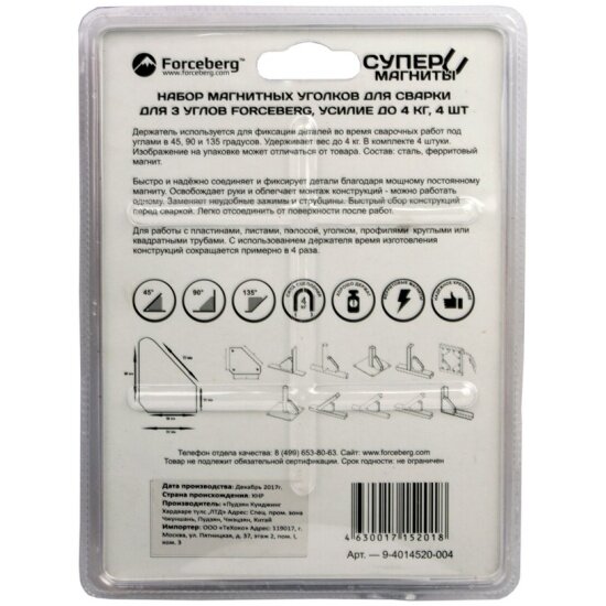 Forceberg Набор магнитных уголков для сварки для 3 углов , усилие до 4 кг, 4 шт 9-4014520-004 .