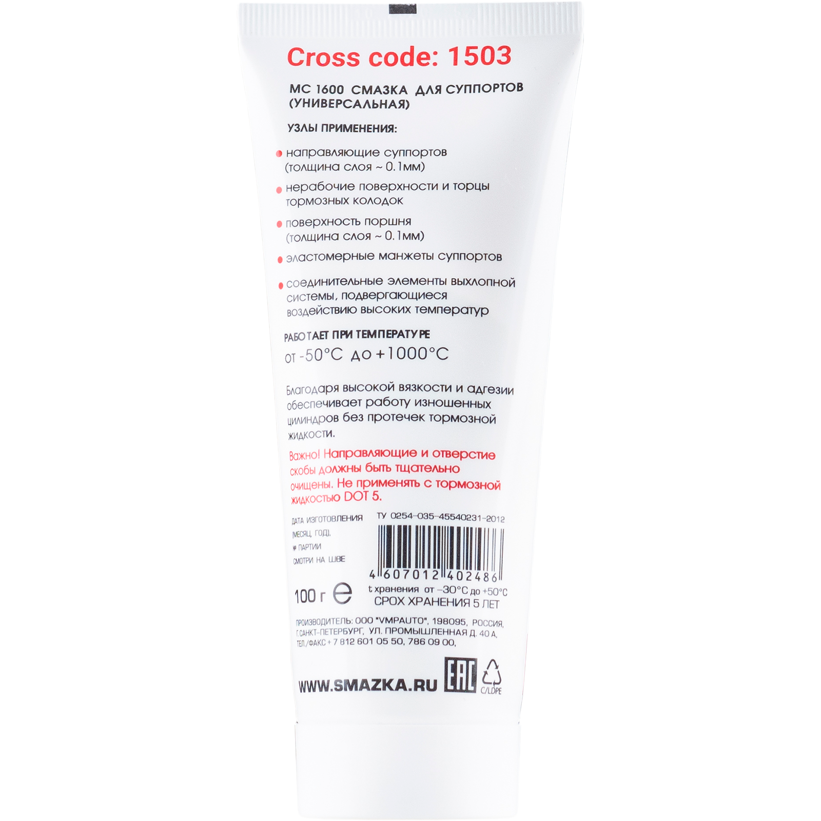 VMPAUTO 1503 Высокотемпературная МС 1600 смазка для суппортов, 100гр туба