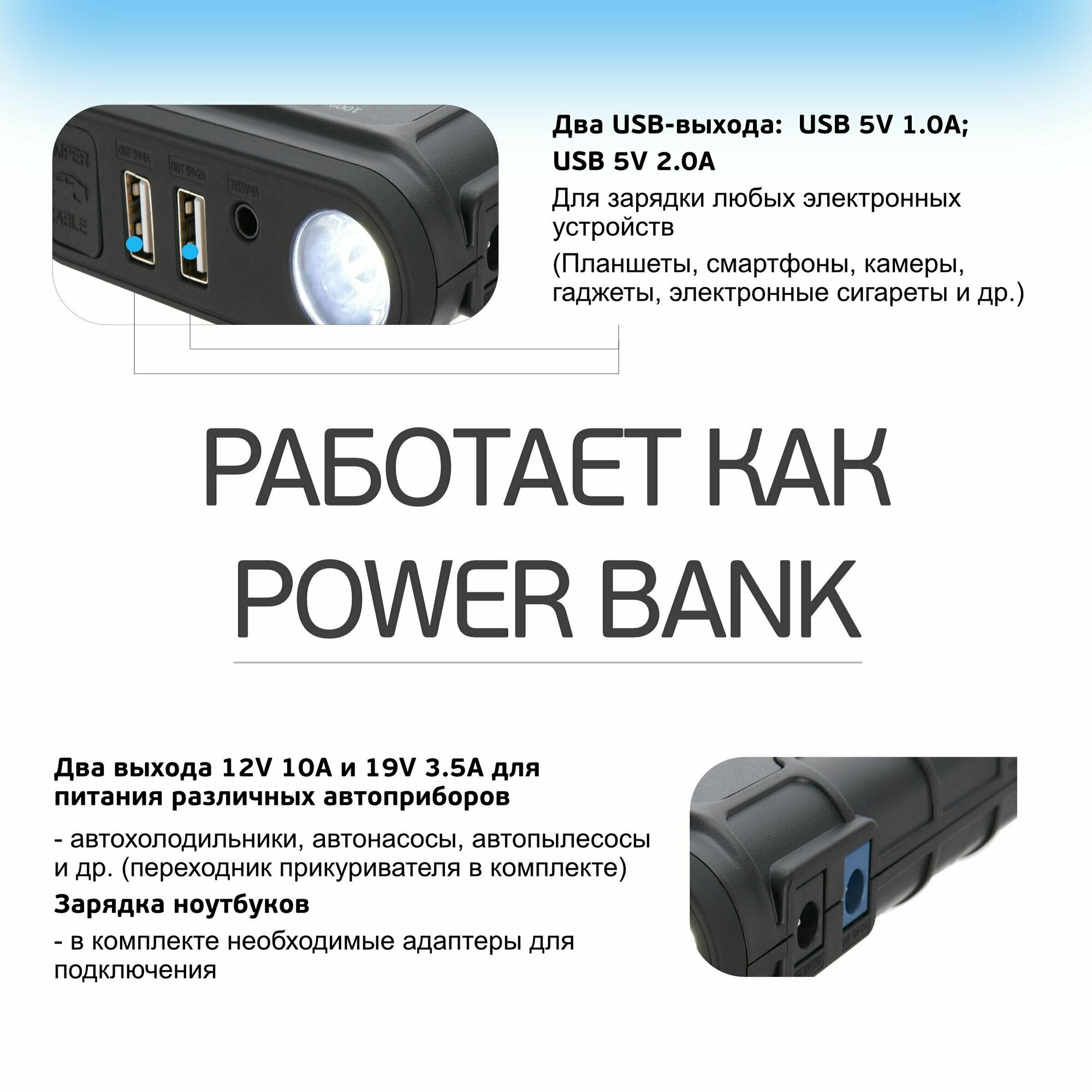 | Плюсы: | Многофункционален. Заводит машину с севшим в «ноль» аккумулятором мгновенно. Заряжать можно ноуты, телефоны и т.п. Плюс фонарь. Заряжается от розетки быстро. Очень удобная вещь, особенно, если уезжать далеко, морозы сильные, тёплый гараж отсутствует. Удобная сумочка-переноска, где хранятся все провода, клеммы для аккумулятора и само устройство. 12000 вполне достаточно для 3-х литрового мотора. |