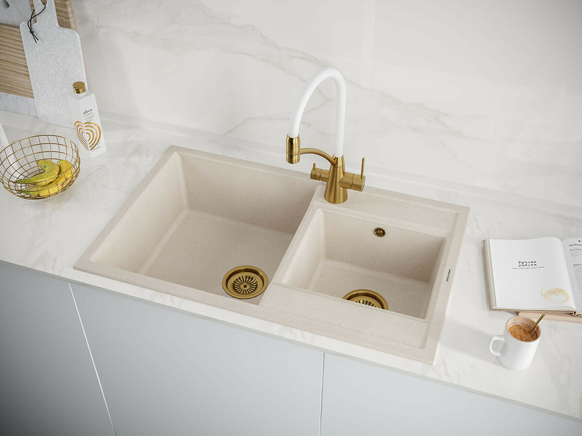Смеситель для кухни с гибким изливом Paulmark SIEGEN, подключение к фильтру питьевой воды, двурычажный, поворотный, латунь / силикон, на мойку / столешницу, бежевый, Si213111-328