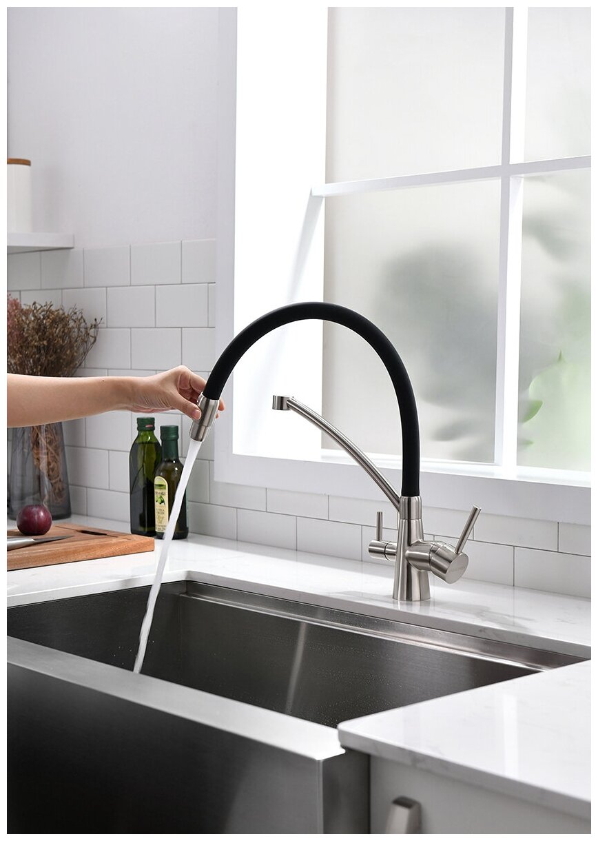 Смеситель для кухни с гибким изливом Paulmark SIEGEN, подключение к фильтру питьевой воды, двурычажный, поворотный, латунь / силикон, на мойку / столешницу, черный, Si213111-308