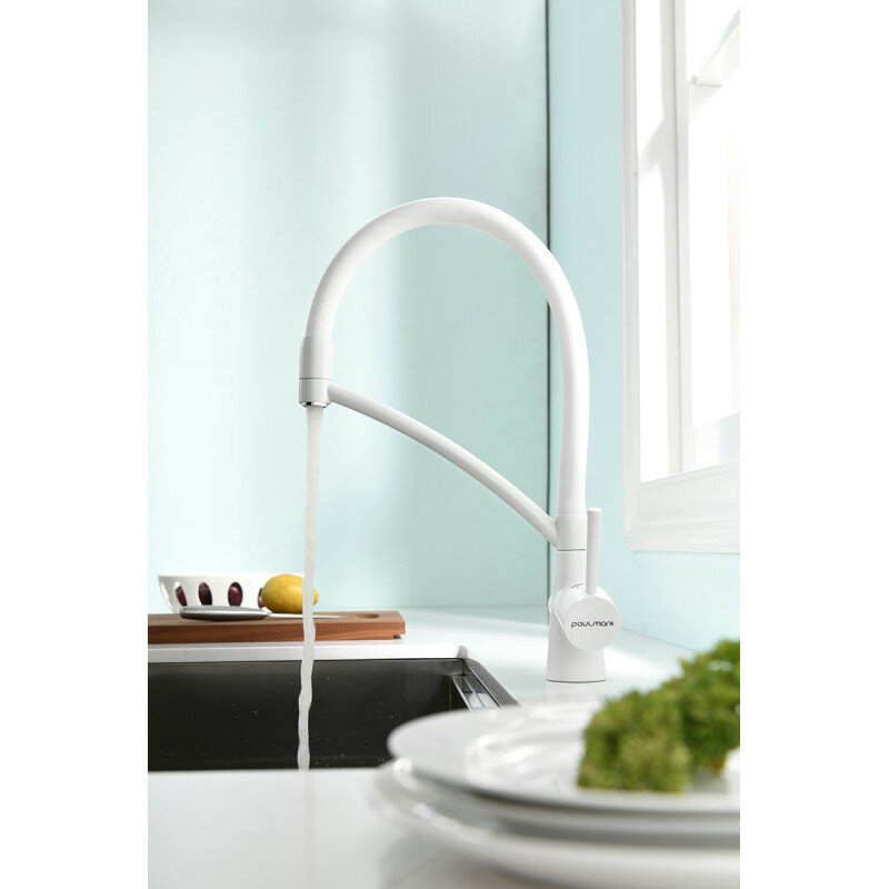 Смеситель для кухни с гибким изливом Paulmark SIEGEN, подключение к фильтру питьевой воды, двурычажный, поворотный, латунь / силикон, на мойку / столешницу, белый, Si213111-331