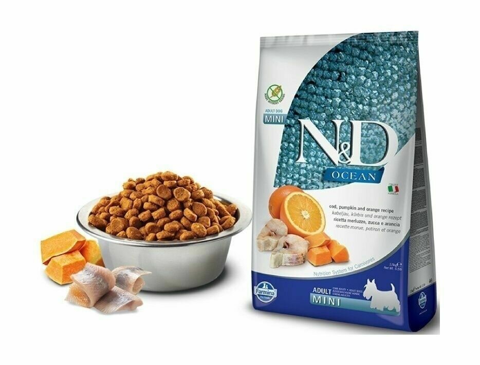 Сухой корм Farmina N&D Ocean Codfish, Pumkin & Orange Adult Mini, для взрослых собак маленьких пород, беззерновой, треска, тыква, апельсин, 2,5 кг