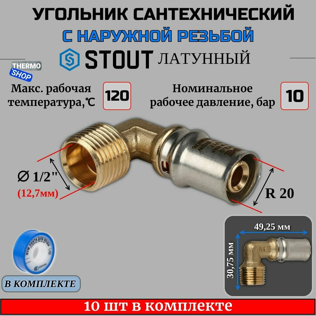 Купить Угольник-переходник с НР 1/2"х20 10 шт для металлопластиковых труб прессовой ФУМ лента 10 м