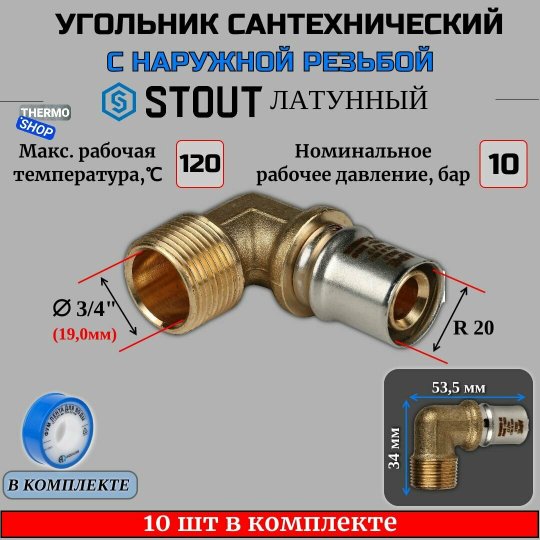 Купить Угольник-переходник с НР 3/4"х20 10 шт для металлопластиковых труб прессовой ФУМ лента 10 м