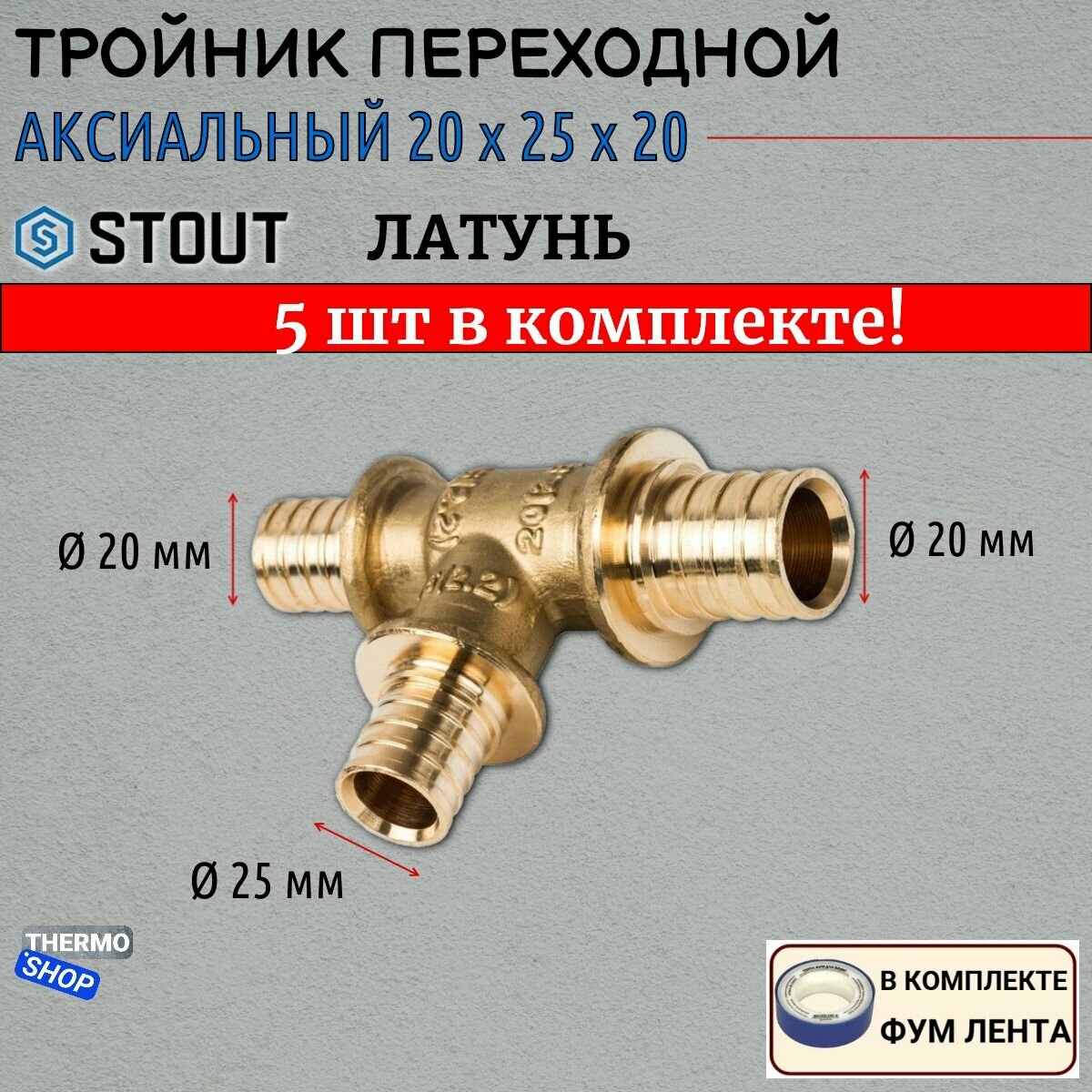 Тройник переходной 25x20x20 для труб 5 шт из сшитого полиэтилена аксиальный ФУМ лента
